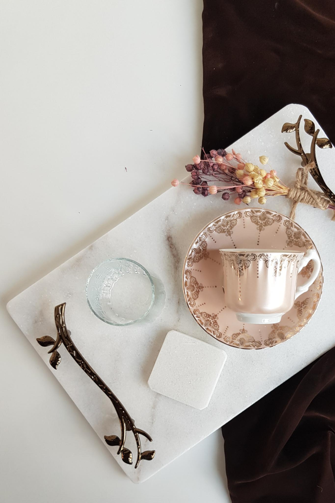 AKASYA Aksesuarlı SET - Mermer Söz & Nişan Tepsisi - Bronz Kulplu