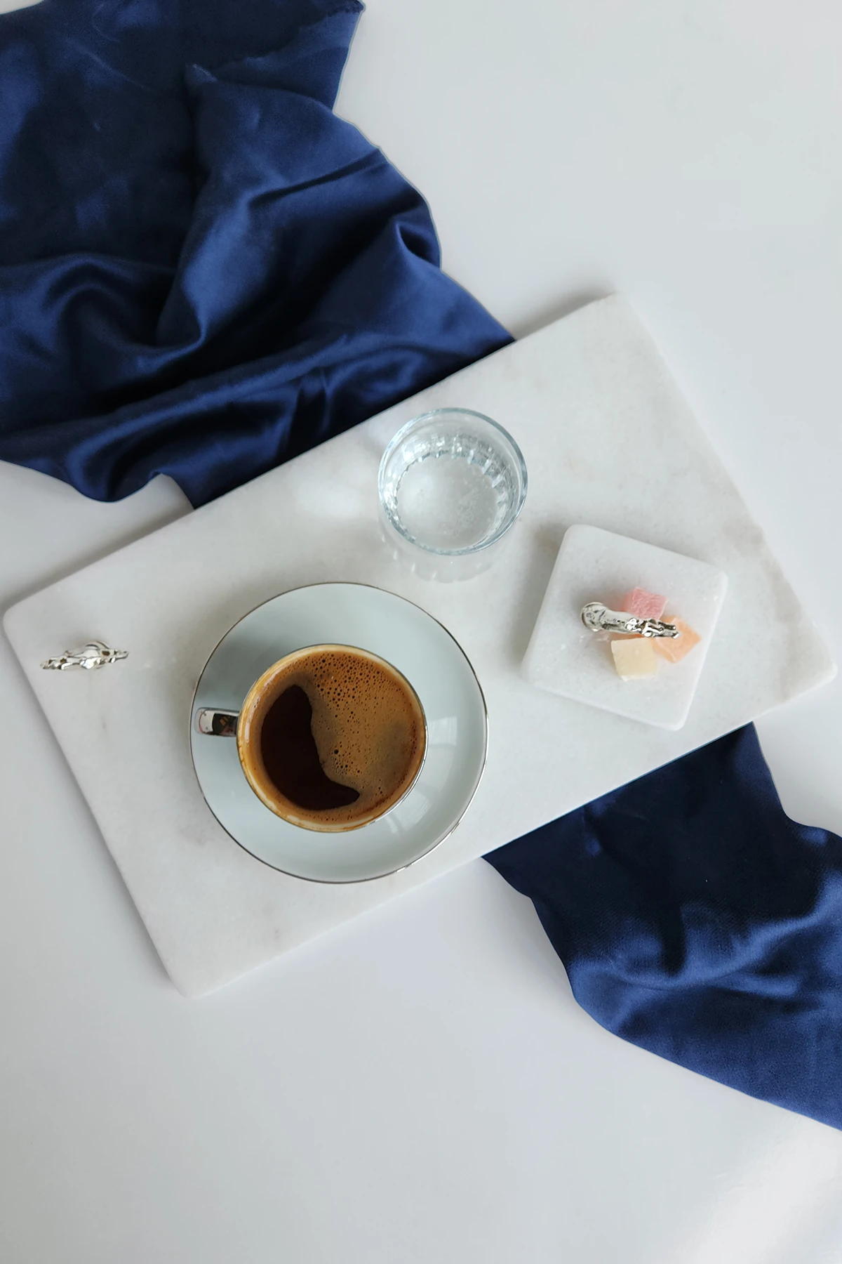 Akasya Mermer Damat Kahvesi Tepsi Seti - Fincan Setli - Gümüş Kulplu